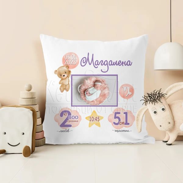 Запечатайте нежните моменти на детството с нашата персонализирана бебешка визитка възглавница, изработена специално с данните на вашето дете, която ще стане олицетворение на неговата уникалност и нежност.