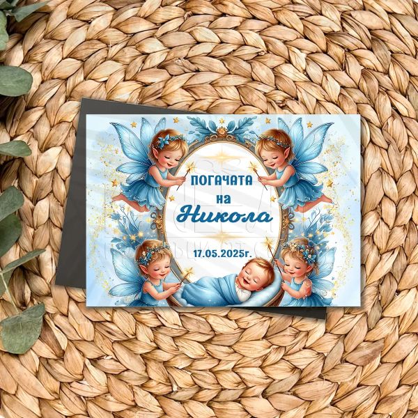 Дизайнът е изпълнен в нежна синя палитра, на феи с прозирни крила, златни искри, детайлна рамка около името и датата. Централният елемент е спящо бебе, който създава усещане за тишина, защита и ново начало.