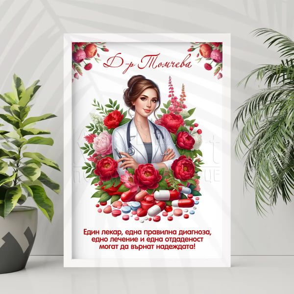 Дизайнът е изключително стилен – изобразен е лекар в бяла престилка, заобиколен от красиви цветя, символ на живот, грижа и надежда. Елегантният шрифт и силното послание добавят емоция и индивидуалност. Постерът е подходящ за декорация в кабинет, дом или като специален подарък, който изразява признателност.