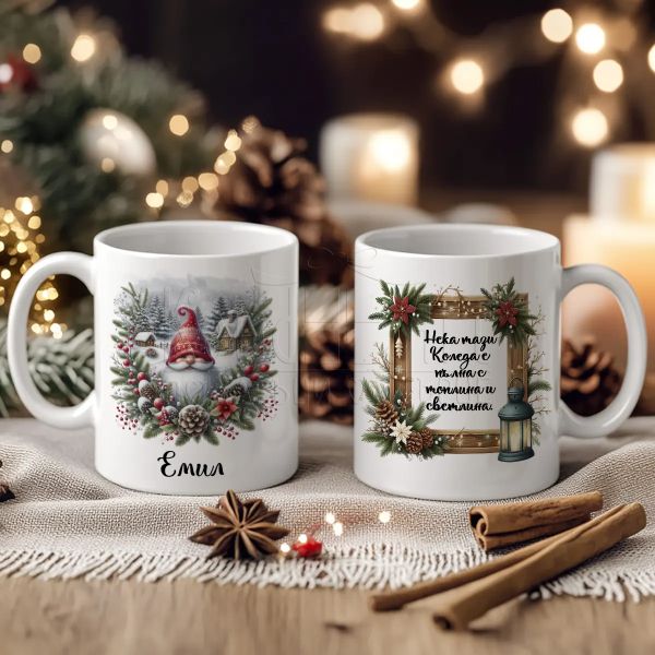 Коледната тематика е представена елегантно и с мъжко излъчване, изчистени линии, сезонни елементи и стилна цветова комбинация. Красива илюстрация прави чашата невероятно уникална. Нейният невероятен стил, украсена с вашето име или името на ваш близък, я прави уникално лична и неповторима.