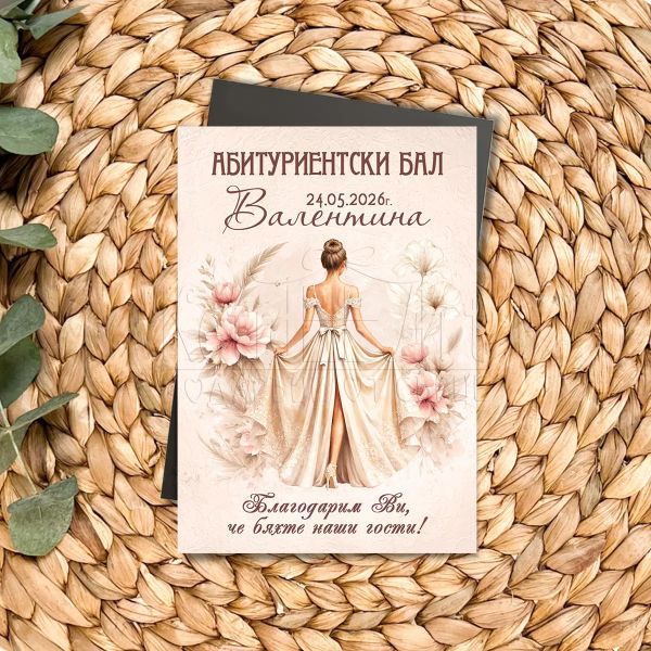 Илюстрацията представя момиче в ефирна бална рокля, заобиколена от меки елементи в топли и пудрени тонове. Визията е нежна, женствена и празнична, с усещане за лекота и тържественост. Магнитът е подходящ за поставяне на хладилник или метална повърхност и остава видим спомен дълго след събитието.