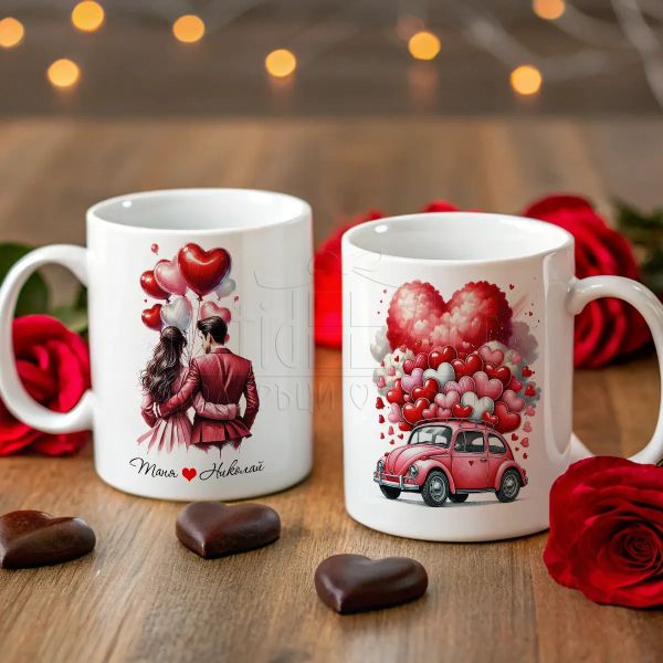 Изработена с висококачествен печат, който запазва цветовете ясни и живи. От едната страна – нежна илюстрация на двойка с балони, от другата – класическа червена кола и облак от сърца. Всяка линия носи топлина, а белият фон подчертава чистотата на емоцията. Формата е удобна, подходяща за всекидневна употреба, но изглежда като малко произведение на изкуството.