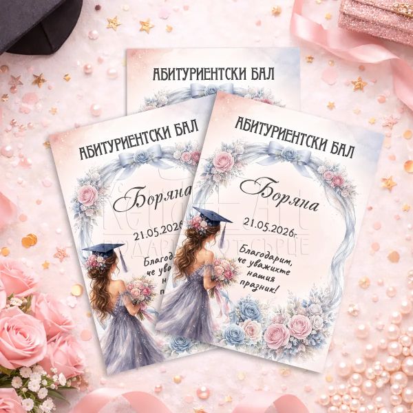 Персонализацията позволява добавяне на име и дата. Дизайнът съдържа илюстрация на абитуриентка и нежна композиция. Компактният формат позволява лесно подаряване на гостите.