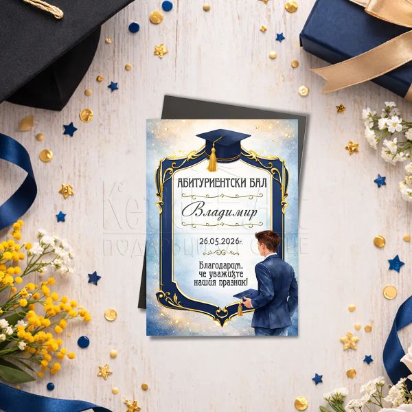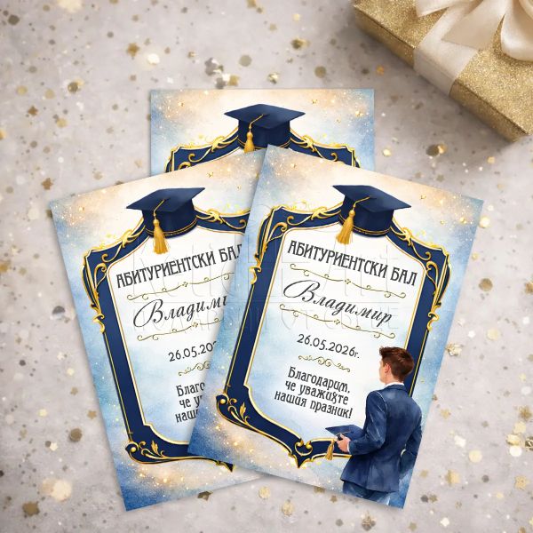 Дизайнът комбинира тъмносиня рамка и златни акценти с академична шапка. Визията е спокойна и подхожда на официалния повод.
