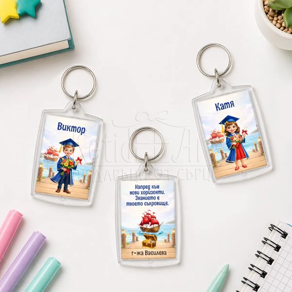 Отличава се с персонализацията, която включва името на всяко дете. Общото послание от учителя прави всеки ключодържател уникален спомен. Това е символ на завършването на един етап. Тематичен дизайн с морски мотиви, който символизира знанието като съкровище и нов хоризонт.